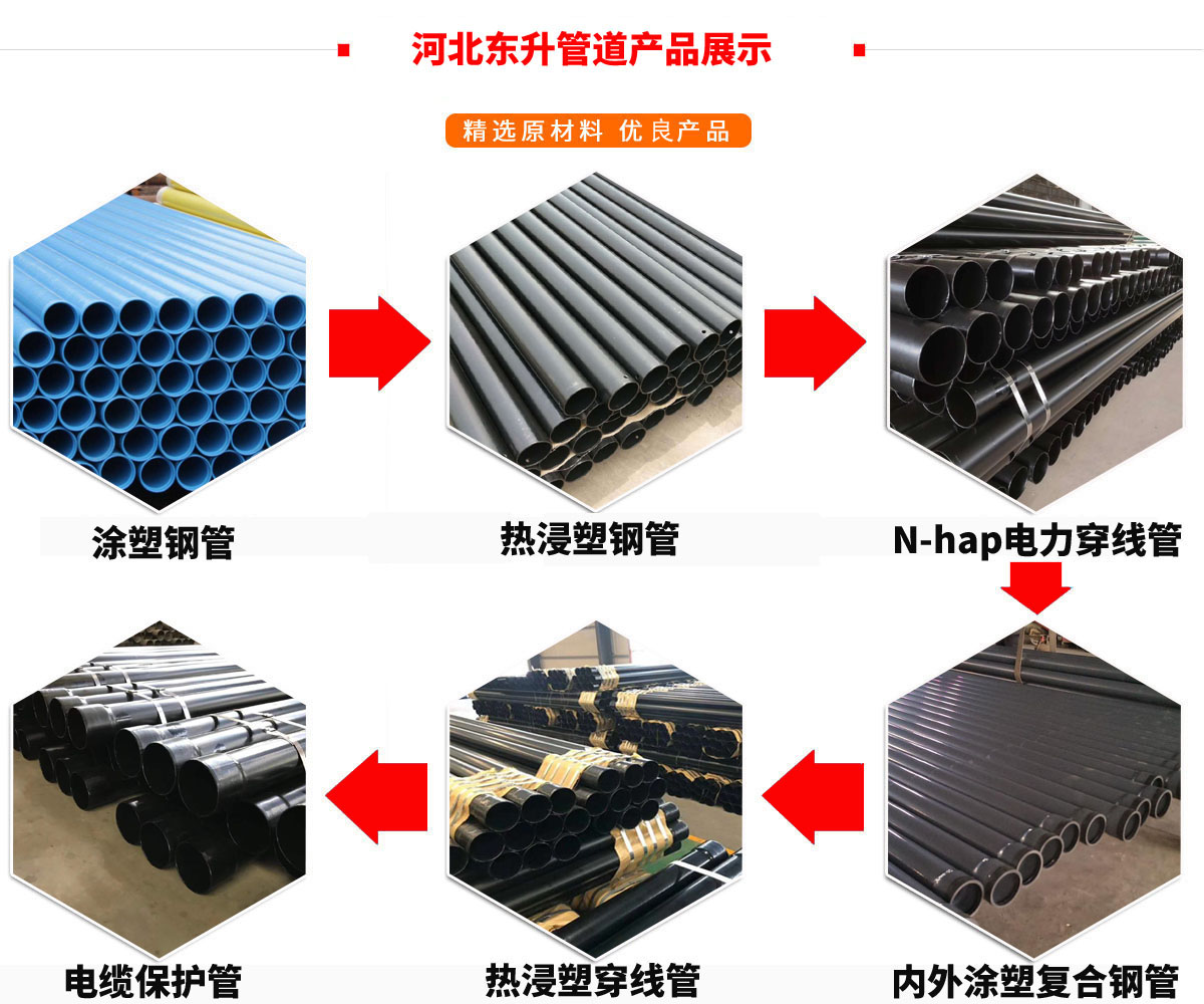 我公司所生產(chǎn)的熱浸塑鋼管、N-hap電力穿線管等系列產(chǎn)品,采用環(huán)保原材料,外觀漂亮,表面平整